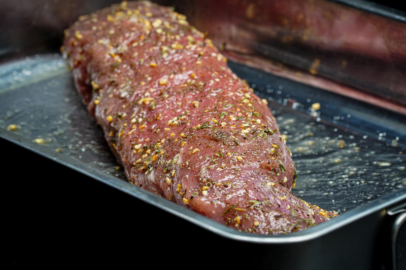 Am nächsten Tag den Monolith auf indirekte Hitze bei ca. 110 °C vorbereiten und die Deflektorsteine einsetzen, um eine gleichmäßige, niedrige Gartemperatur zu erreichen. Die Schweinefilets auflegen und langsam bis zu einer Kerntemperatur von 60 °C garen – das dauert etwa 1 bis 1,5 Stunden. Anschließend das Fleisch vom Grill nehmen und 5–10 Minuten ruhen lassen.