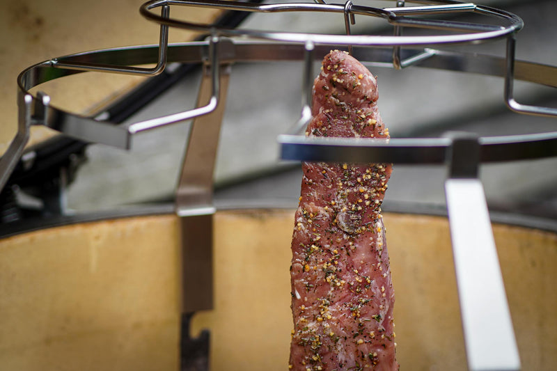 In der Zwischenzeit den Monolith mit dem Smoke Set für das Kalträuchern vorbereiten. Dafür die Räucherschnecke mit Buche- oder Apfelholzspänen befüllen und den Grill auf 20–25 °C einregeln. Die Filets an das Smoke Set hängen und für etwa 6–8 Stunden kalträuchern. Danach über Nacht im Kühlschrank ruhen lassen, damit sich das Raucharoma gleichmäßig im Fleisch verteilt.