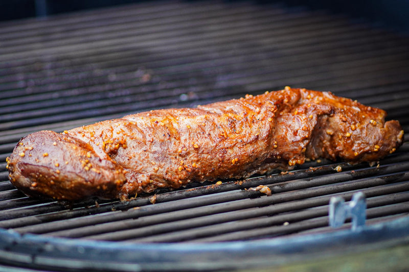 Den Monolith auf indirekte Hitze bei ca. 110 °C vorbereiten und die Deflektorsteine einsetzen, um eine stabile, gleichmäßige Temperatur zu erreichen. Wer ein dezentes Raucharoma wünscht, kann eine kleine Handvoll Apfel- oder Kirschholz auf die Glut legen. Die Schweinefilets auf den Rost legen und langsam bis zu einer Kerntemperatur von 60 °C garen – das dauert etwa 1 bis 1,5 Stunden. Anschließend die Filets über direkter Hitze je Seite etwa 1 Minute angrillen, um eine leichte Kruste und Röstaromen zu entwickeln. Danach 5–10 Minuten ruhen lassen, damit das Fleisch saftig bleibt.