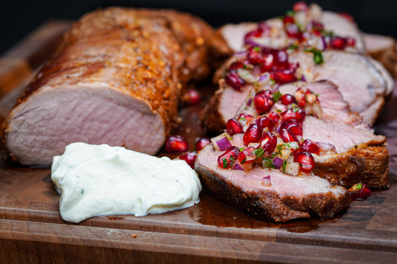 Zum Servieren das Schweinefilet in Scheiben schneiden, mit einem Klecks griechischem Joghurt und etwas Zitronenschale auf Tellern anrichten und die frische Granatapfel-Salsa darüber geben. Mit Minze oder Petersilie garnieren.