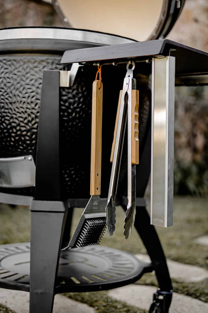 Avec son design unique, le support AVANTGARDE est une pièce maîtresse ! Simple et pourtant accentué, il met le Kamado en scène et offre un soutien durable et sûr. Le matériau et la finition mate sont résistants aux intempéries et à l'usure. La plaque de fond n'est pas seulement magnifique, elle offre également un espace supplémentaire pour les ustensiles de barbecue.