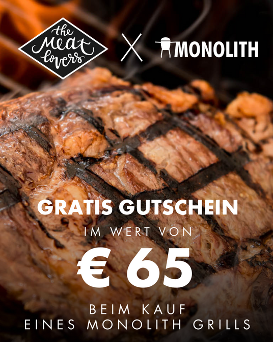 Envoie ta preuve d'achat d'un MONOLITH Kamado Grill à : MONOLITH Cash Back Action (promotion@monolith-grill.eu) et tu recevras ton code de bon personnel* pour un €65,- de The Meatlovers !