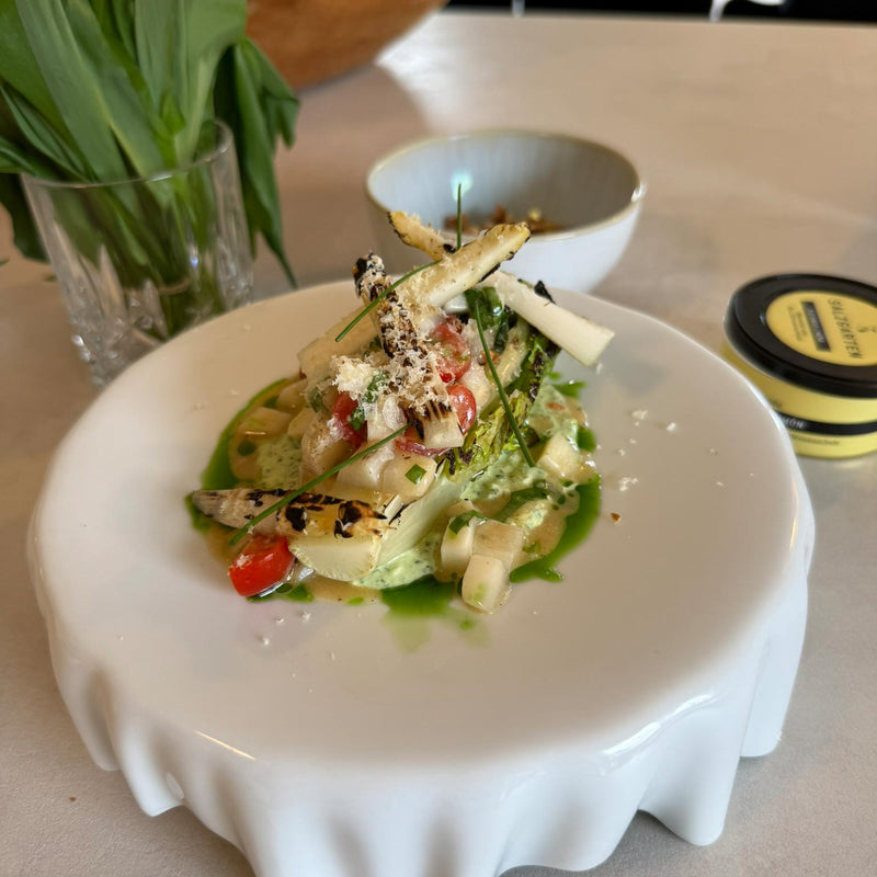 Spargelwürfel, Tomaten und Bärlauch mit der Vinaigrette vermengen. Kurz durchziehen lassen (2–3 Minuten), damit sich die Aromen verbinden. Spargelspitzen separat mit Salz und Pfeffer würzen und für das Anrichten bereithalten.