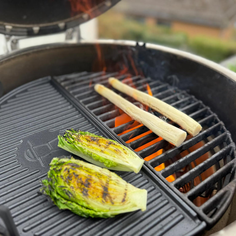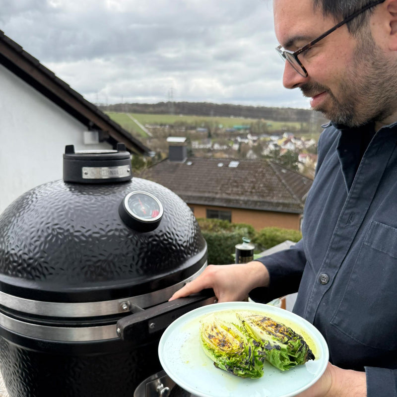 Den Grill auf ca. 250 °C direkte Hitze vorheizen. Den Salat mit der Schnittfläche nach unten auf den Grill legen und ca. 1–2 Minuten grillen, bis deutliche Grillstreifen entstehen. Anschließend wenden und kurz auf der Rückseite angrillen (ca. 30–60 Sekunden). Der Salat soll außen Röstaromen entwickeln, innen aber noch knackig bleiben. Vom Grill nehmen und auf einem Gitter oder Teller ruhen lassen, damit er nicht nachgart.