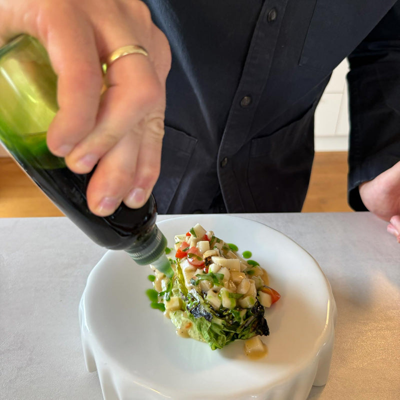 Den Mini-Romana sorgfältig putzen, dabei welke äußere Blätter entfernen. Den Strunk nur minimal kürzen, damit die Blätter zusammenhalten. Den Salat längs halbieren, sodass zwei stabile Hälften entstehen. Die Schnittflächen leicht mit Olivenöl einreiben – das verhindert Ankleben und fördert Röstaromen. Beide Hälften gleichmäßig mit Flor de Sal Limon und frisch gemahlenem Pfeffer würzen.