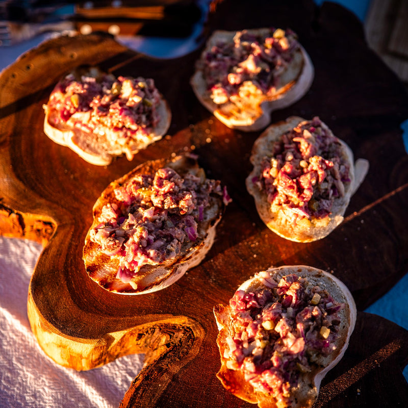 Für das Tatar das geschnittene Fleisch mit etwas Mayo, roter Zwiebel, saurer Gurke und Senf vermengen.Zurückhaltend würzen, denn das Fleisch gibt den Ton an.