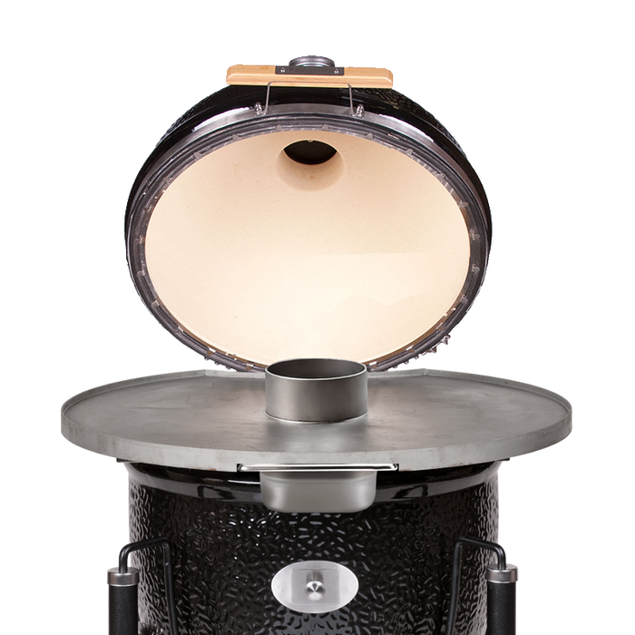De 8 mm dikke stalen vuurplaat met een diameter van 78 cm voor het model .55 en 84 cm voor het model .66 heeft een ronde uitsparing voor het deksel. Hij wordt eenvoudig op het MONOLITH-rooster geplaatst en de temperatuur kan zoals gewoonlijk worden geregeld dankzij het kleppendeksel. Bij de ICON en JUNIOR is de plaat 6 cm dik en heeft hij een diameter van 60 cm. Nadat het deksel is verwijderd met de praktische vleugelschroeven, kan het op de grill worden geplaatst - zo wordt de ICON een plancha op tafel!