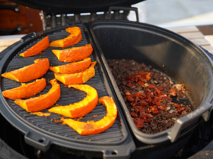 Stoven in de Dutch Oven stijl en dichtschroeien tegelijk - een MONOLITH Dutch Oven kan het allebei! Het deksel kan ook apart worden gebruikt als gietijzeren plancha. En de MONOLITH Dutch Oven, of het er nu één is of twee tegelijk, past perfect in de Kamado barbecue dankzij het halfronde ontwerp.